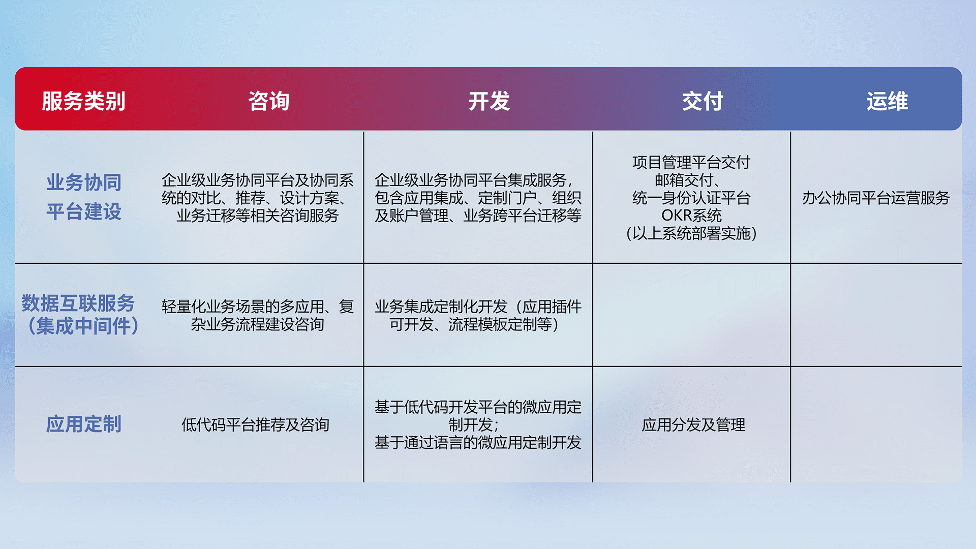 针对钉钉、、企微、、IDaas等平台级产品提供产品的规划、、方案、、交付、、、、定制化开发等服务,,实现如统一协同办公、、、智能客户服务、、、混合会议管理、、、、智能数据查询、、等业务场景,,实现数字化转型。。。。